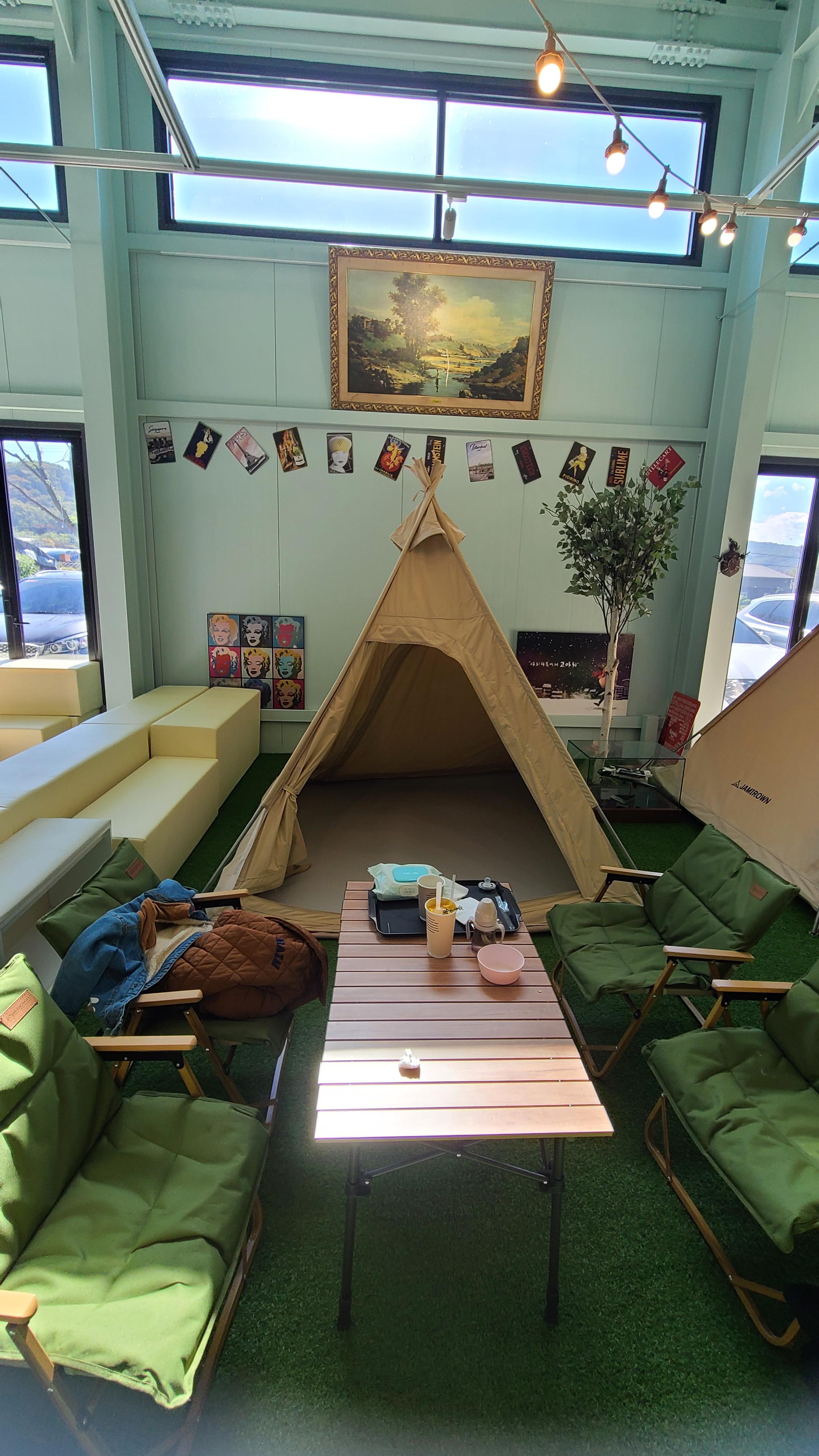 텐트존은 2시간의 이용제한이 있는데 텐트안에서의 놀이도 가능하고 실내 놀이터가 바로 옆이라서 편하게 즐길 수 있습니다. 텐트 자리 이외에도 많은 자리 들이 엔틱하게, 또는 내츄럴한 분위기로 잘 꾸며져 있어서 어디자리든 추천합니다.