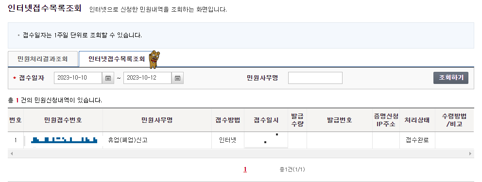 처리가 완료되면 민원내역에서 다음 사항을 확인합니다.