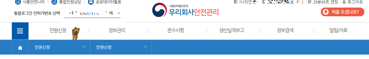 재가입 후 아래 화면과 같이 우리회사 안전관리로 들어가서 민원신청으로 클릭합니다.
